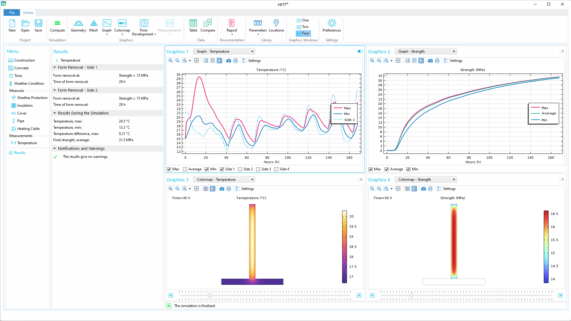 Contractors can predict the potential outcome of a concrete casting process by using the maturity method, but it can be difficult to apply this technique in the field. This is why Heidelberg Materials, one of the world's largest suppliers of cement, aggregates, and precast and ready-mixed concrete, provides its customers in Sweden and Norway with the computer program they call HETT. (Ref. 1) They have participated in the development of multiple generations of HETT, but the new version is different: HETT22 is a compiled simulation app that provides timely access to forecasts based on multiphysics models that account for site conditions, ambient temperatures, material selections, and other relevant variables. HETT22 and its associated models were created for Heidelberg Materials by Deflexional, a COMSOL Certified Consultant that specializes in using the COMSOL Multiphysics® software to build multiphysics models and simulation apps (Ref. 2). After using the Application Builder to turn the models into a custom app, Deflexional used COMSOL Compiler™ to deploy it. In just six months after launch, HETT22 was downloaded more than 1100 times.